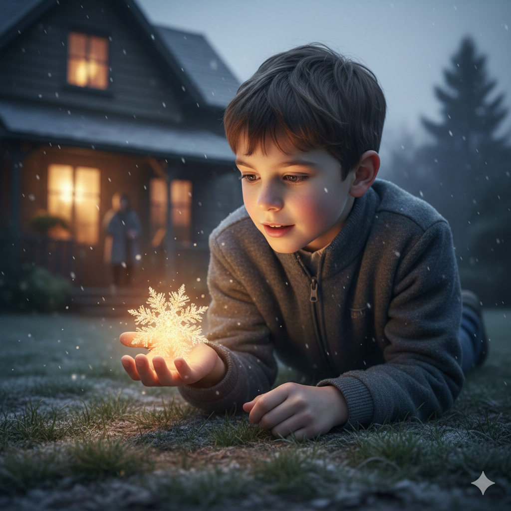 Gergő gyorsan felöltözött, és szaladt ki a kertbe. A hideg levegő azonnal megcsapta az arcát, de ő észre sem vette. Letérdelt a fűbe, és óvatosan, mintha porcelánból lenne, felemelte a csillogó hópelyhet. A bőre bizsergett, amint a hideg kristályok a tenyeréhez értek. Nem volt olyan hideg, mint egy közönséges hópehely, inkább kellemesen hűvös, mint egy selymes ékszer.