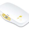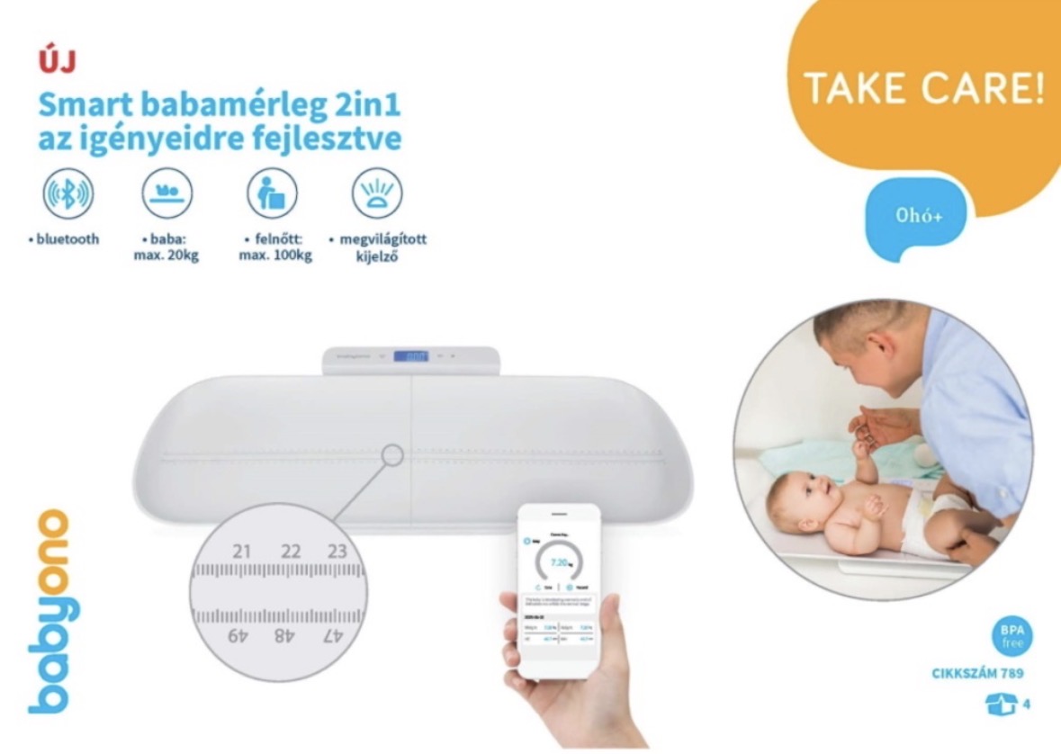 A speciálisan kialakított összehajtható tálcán 20 kg-os súlyig mérhető kisbaba. A leszerelése után a mérleg alkalmas nagyobb gyermekek és felnőttek testsúlyának mérésére is 100 kg-ig. Követhetjük a gyermek súlyát a termékhez illő Baby Fit applikációval, amihez a mérleg vezeték nélkül csatlakoztatható, segítségével a súly, testhossz, fejkörfogat és BMI adatokat tudjuk elemezni és tárolni. Ergonomikus és stabil kialakítású tára funkcióval. Pontos mérés: +/- 0,01 kg. A tálcán mérőszalag segíti a baba testhosszának lemérését.